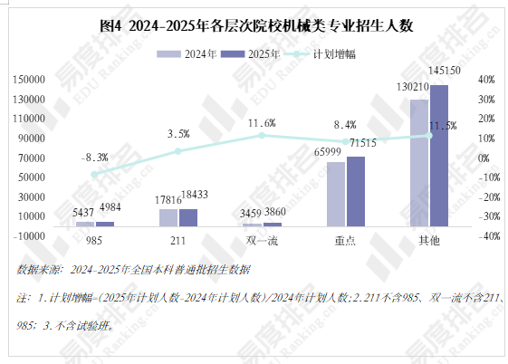 985院校机械类招生人数波动式下降,其他各条理院校则有3%-12%的涨幅,机械类专业招生打算人数逐年添加,正在2023年触底后回升。